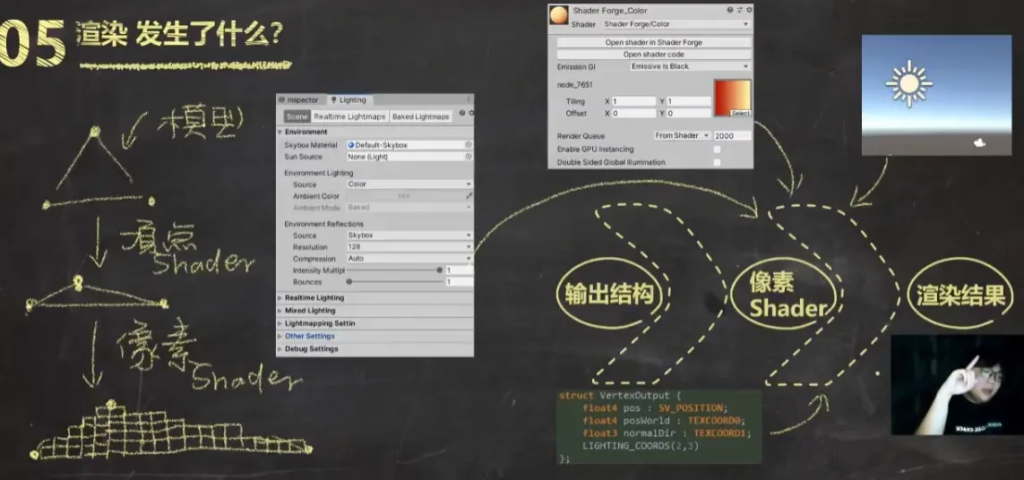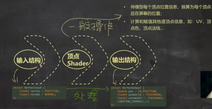 输入结构接收到模型数据后,会传入顶点Shader中进行计算,主要进行空间转换的计算,可能会有顶点数据的计算(顶点动画),随后传入输出结构中。