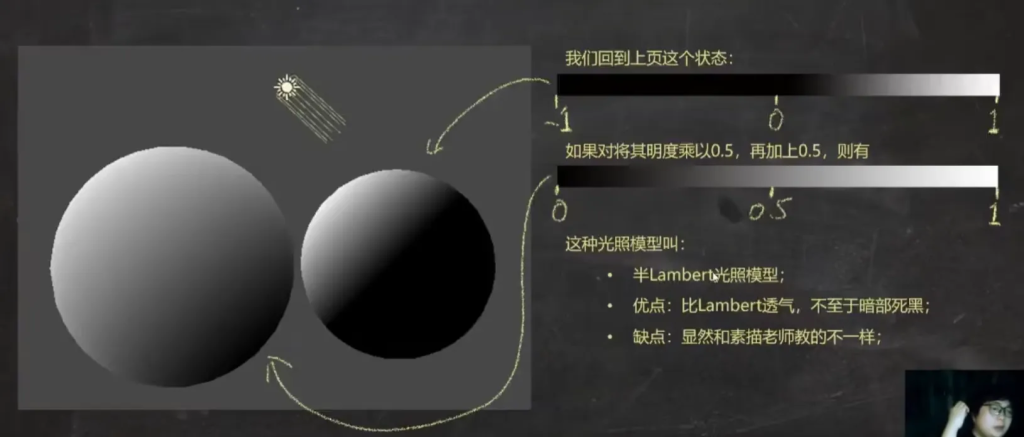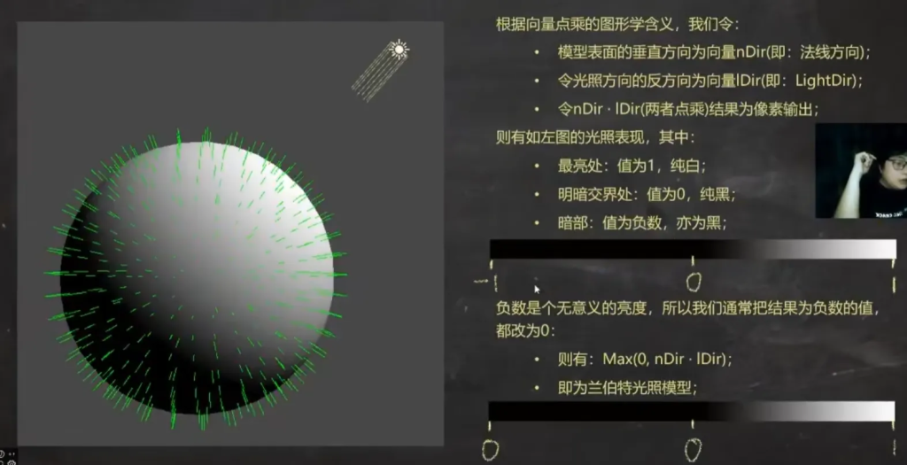 图形学中,通过模型表面 法线方向 与 光照方向 点乘操作,可以得到-1到1的值;