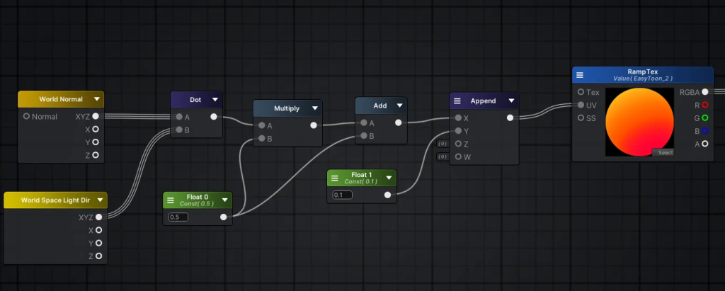 这里的意思就是给上述明暗部分上颜色,使用一张RampTexture渐变贴图,NdotL点乘结果作为u坐标,v坐标随意,Append合成一个新的向量,去采样Ramp贴图。