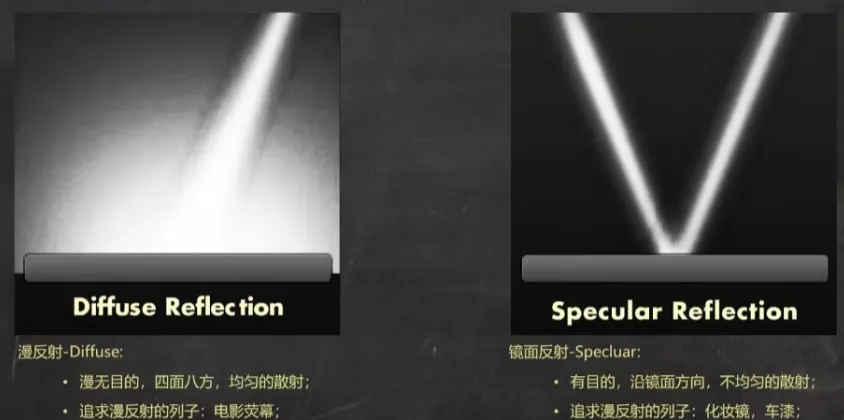 - 因其反射有明显方向性,所以观察者的视角决定了反射光线的有无,明暗