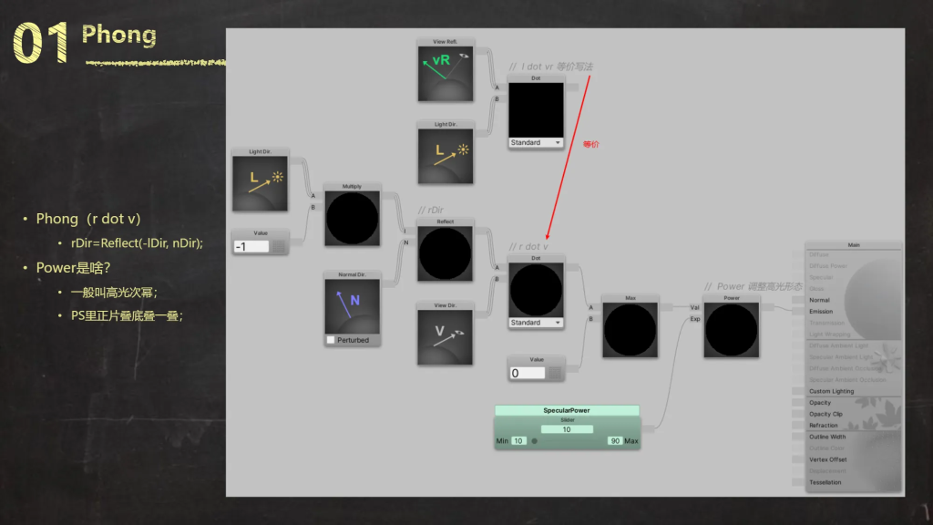 - Phong(R dot V),即光反射方向和视角方向越重合,反射越强