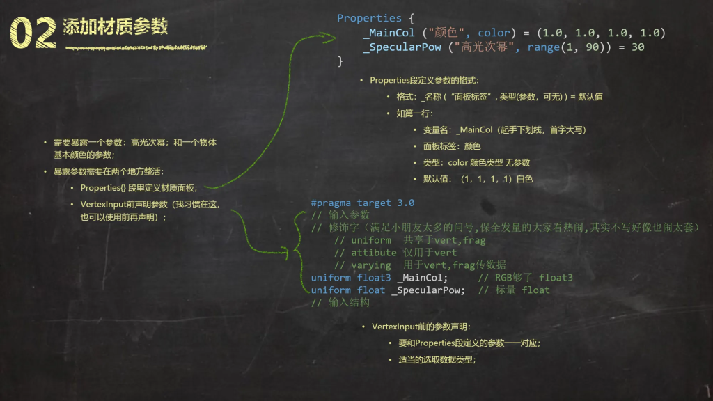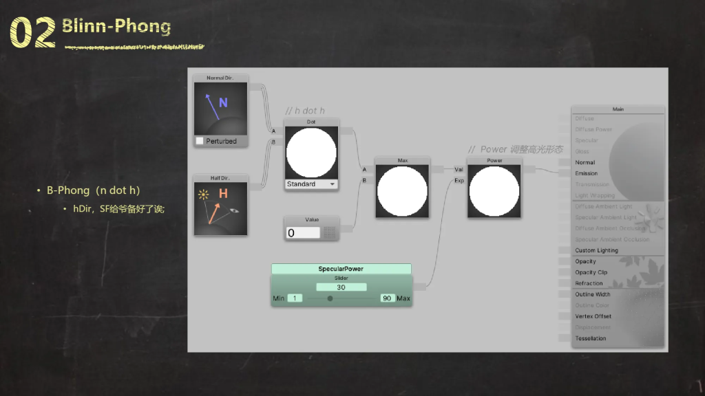 - Blinn-Phong(N dot H),即法线方向和半角方向越重合,反射越强